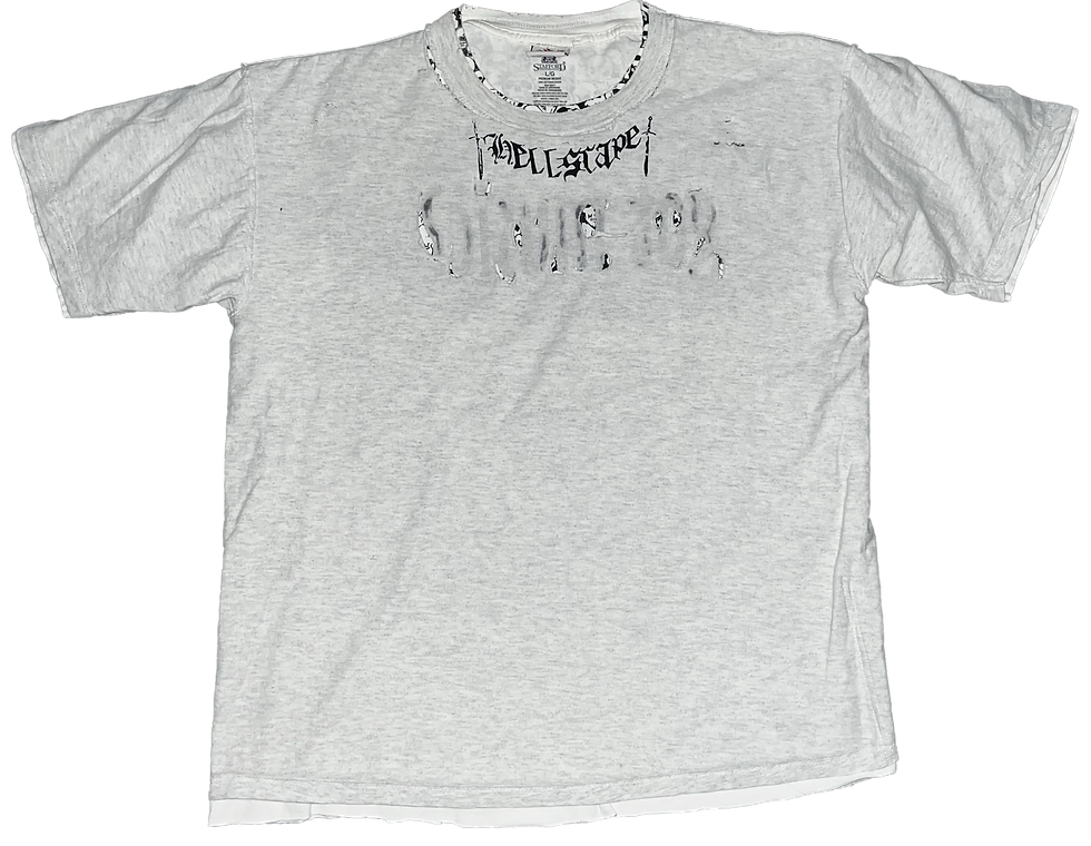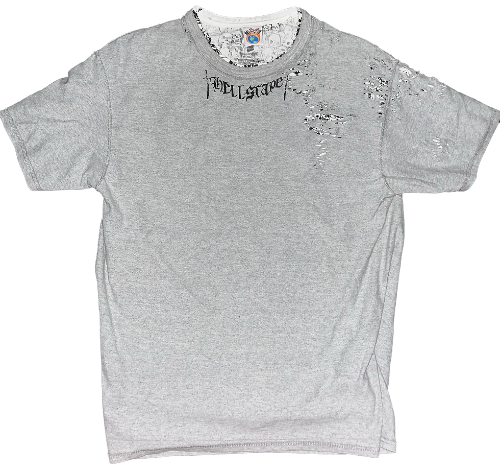 Hand Drawn DESIGNS BURNT STRAIGHT TO SCREEN. 488 Skulls ON EACH SIDE UNDERSHIRT WITH SKULL GRAPHIC, OVERSHIRT DISTRESSED TO SHOW SKULLS UNDERNEATH. SEWN TOGETHER AND REPAIRED Never DESIGNED ON A COMPUTER. HAND NUMBERED. No Restocks. PRINTED ON THRIFTED SHIRTS. SOME OF THE COLLECTION IS Flipped Inside Out. PREWASHED. SHIPPED IN 1-3 DAYS.
